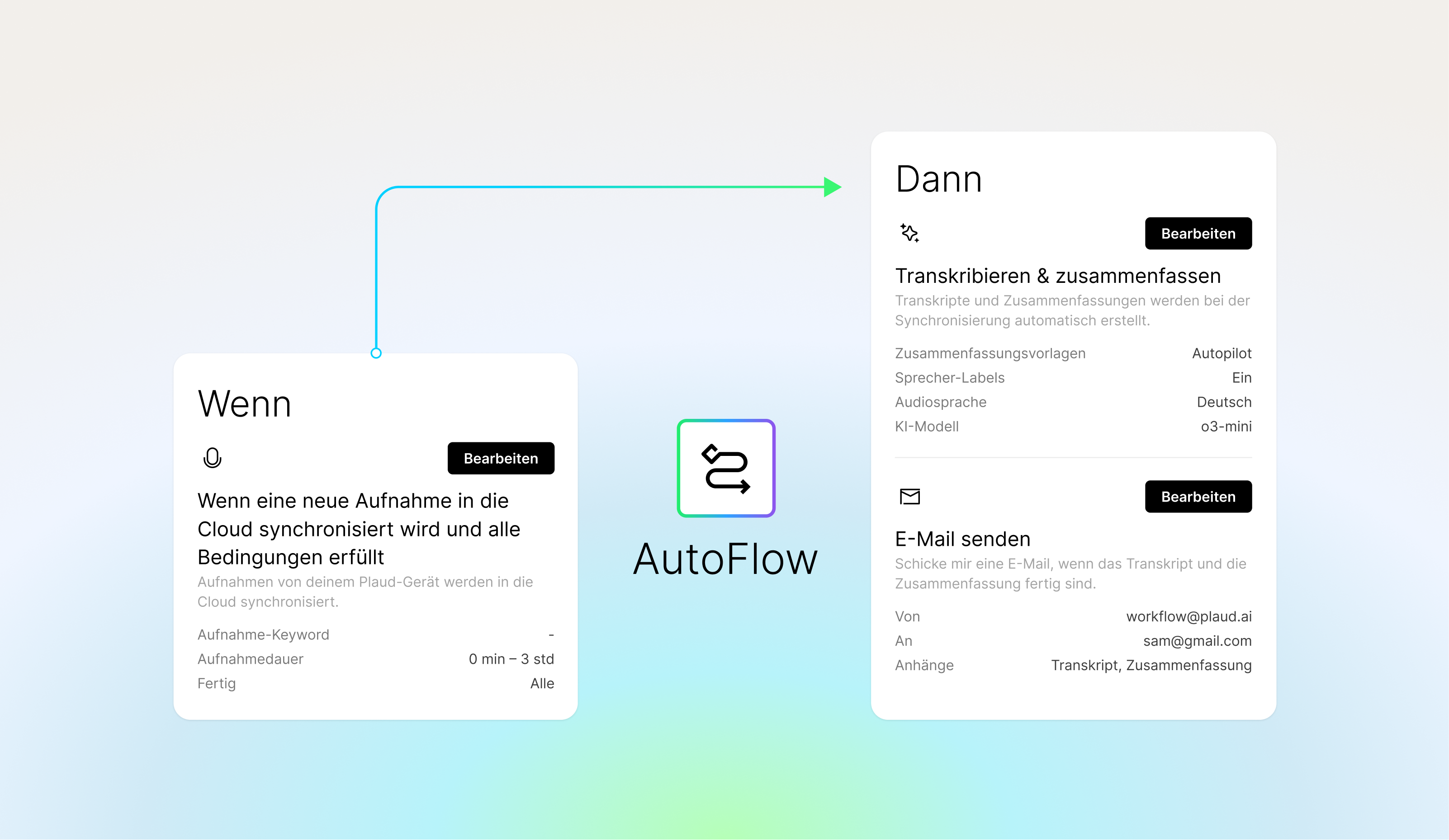 Sendet das Transkript und die Zusammenfassung automatisch an die voreingestellte E-Mail-Adresse.