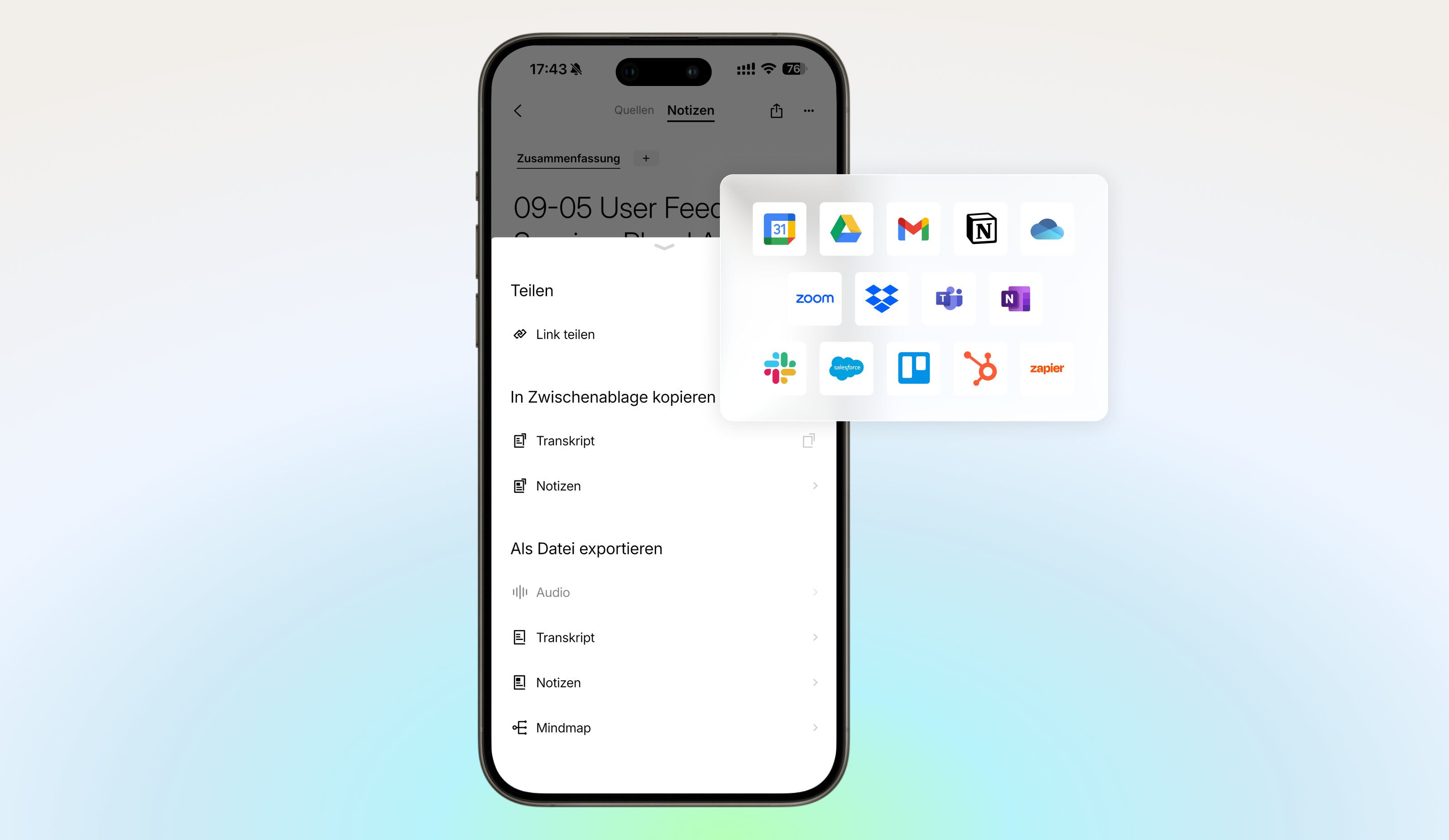Exportiere Aufnahmen, Transkripte, Zusammenfassungen und Mind-Maps mit vollständiger Kontrolle darüber, was du behältst und teilst. Teile Dateien mit nur wenigen Klicks, mit Unterstützung für mehr als 27 Formate.