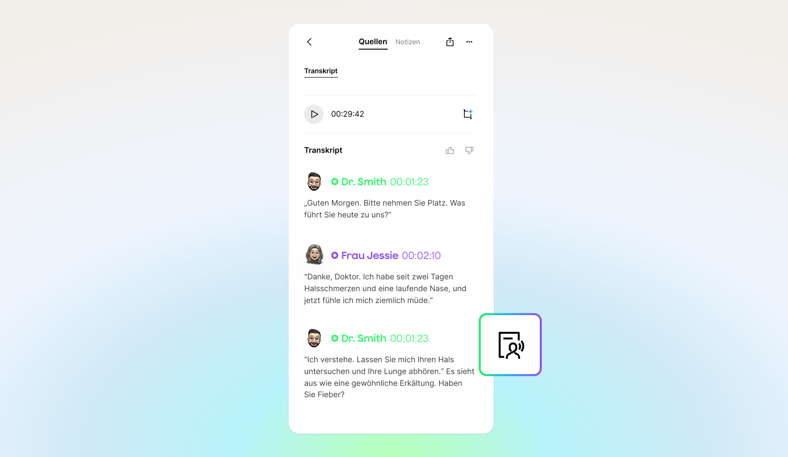 Die KI-gestützte Diarisierung unterscheidet jede Stimme genau und verdeutlicht, wer was gesagt hat, von Patientenanliegen bis hin zu Behandlungsempfehlungen.