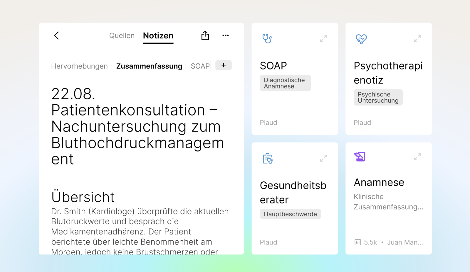 Plaud transkribiert deine Sprechstunden präzise – einschließlich der Fachbegriffe – und erstellt SOAP-Notizen und Zusammenfassungen aus verschiedenen Perspektiven. Du erhältst umgehend eine strukturierte, regelkonforme Dokumentation, sodass du dich auf die Pflege konzentrieren kannst – und nicht auf Verwaltungsaufgaben.