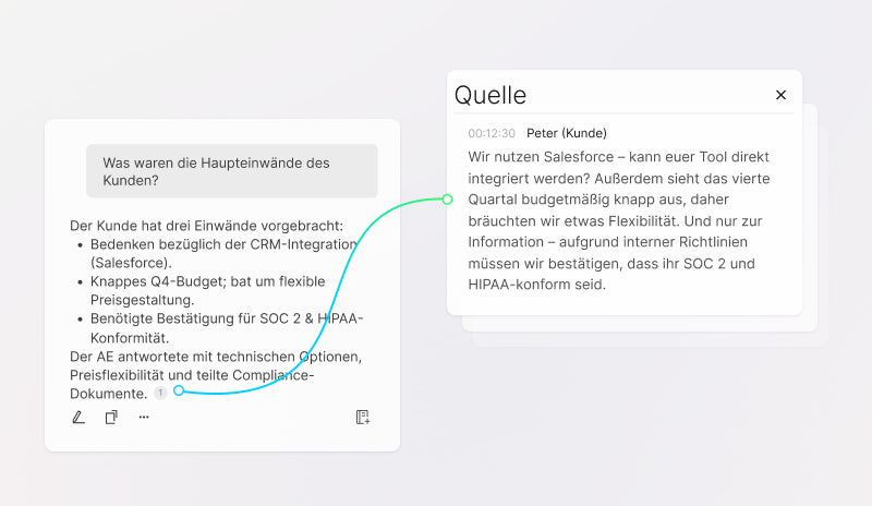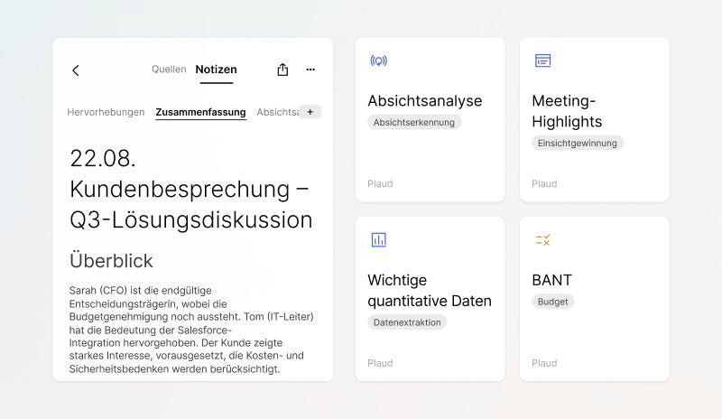 Halte nach Gesprächen den Fuß auf dem Gaspedal, indem du Notizen, nächste Schritte und Nachfassaktionen nahtlos in deinen vertrauten Tools erstellst.