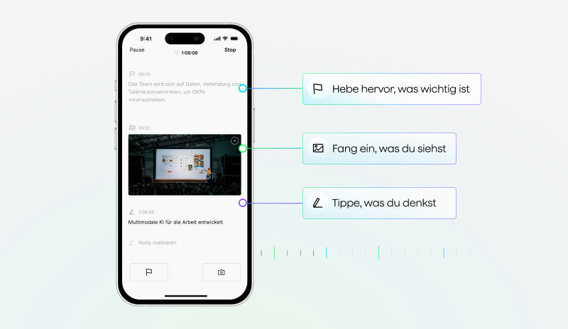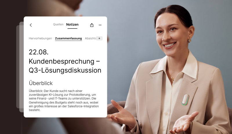 Bleibe im Raum konzentriert, während Gespräche erfasst, verarbeitet und intelligent mit Kontext und Nuancen strukturiert werden.