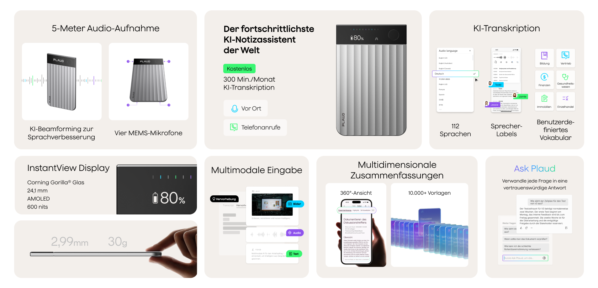 - Ask Plaud: Fragen Sie Notizen ab, gewinnen Sie Erkenntnisse und erstellen Sie Inhalte in natürlicher Sprache.