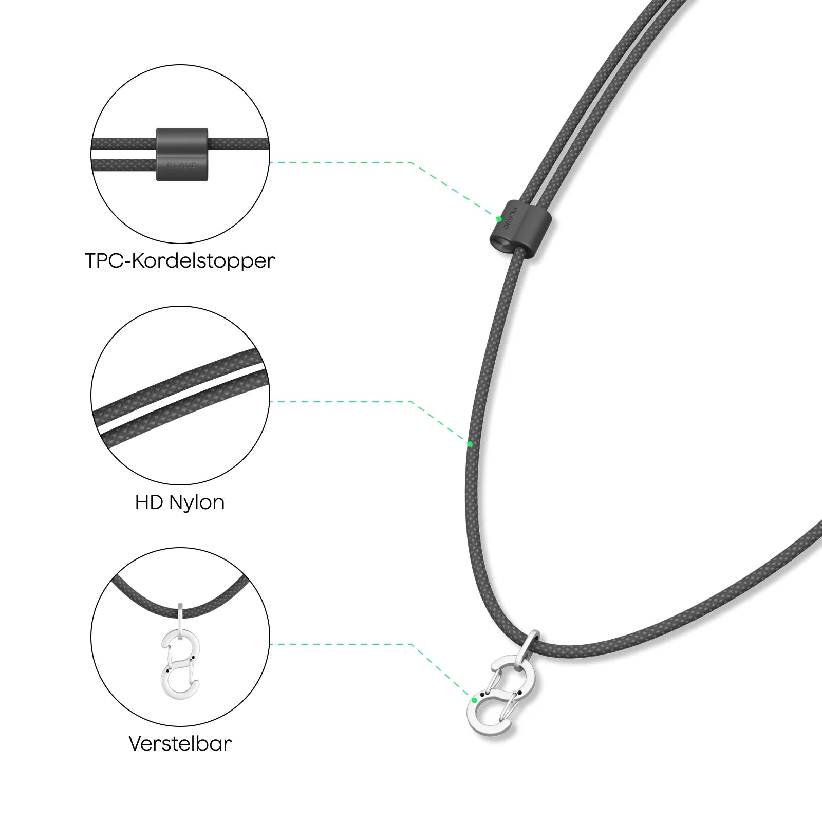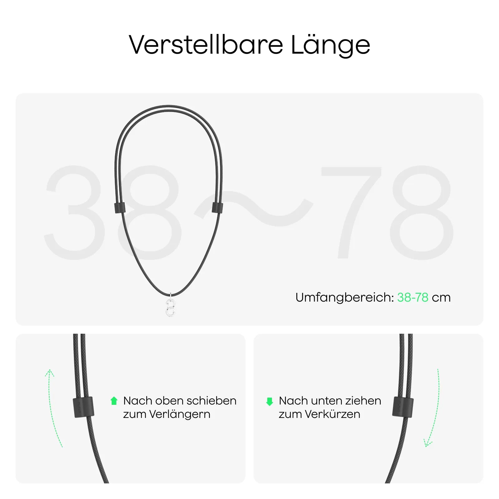 Dank der doppelten Verstellmöglichkeit lässt sich die Länge ganz einfach anpassen (ca. 20–38 cm) und sorgt so für einen bequemen, nicht scheuernden Sitz, den du den ganzen Tag über um den Hals tragen kannst, egal ob in Meetings oder unterwegs.